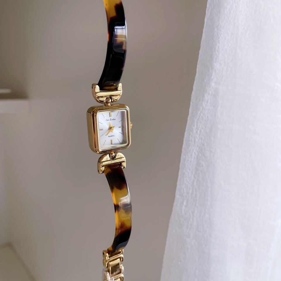 El reloj de cuarzo para mujer con caja dorada y correa estilo carey ámbar combina simplicidad y sofisticación. Su diseño moderno y atemporal lo convierte en el accesorio ideal para oficina, universidad o salidas casuales, elevando cualquier look con un toque elegante.